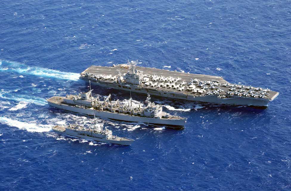 USS Carl Vinson CVN-70 getting a VERTREP from USS Sacramento AOE-1 while USS Ingraham FFG-61 takes on fuel in 2003 during my last deployment